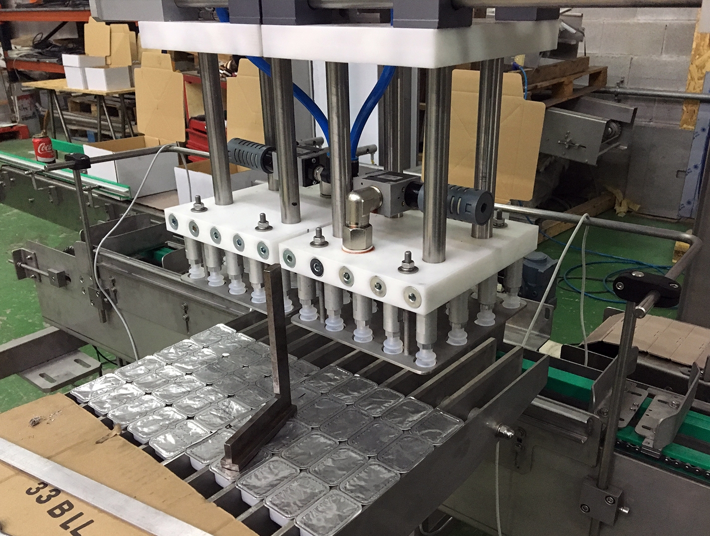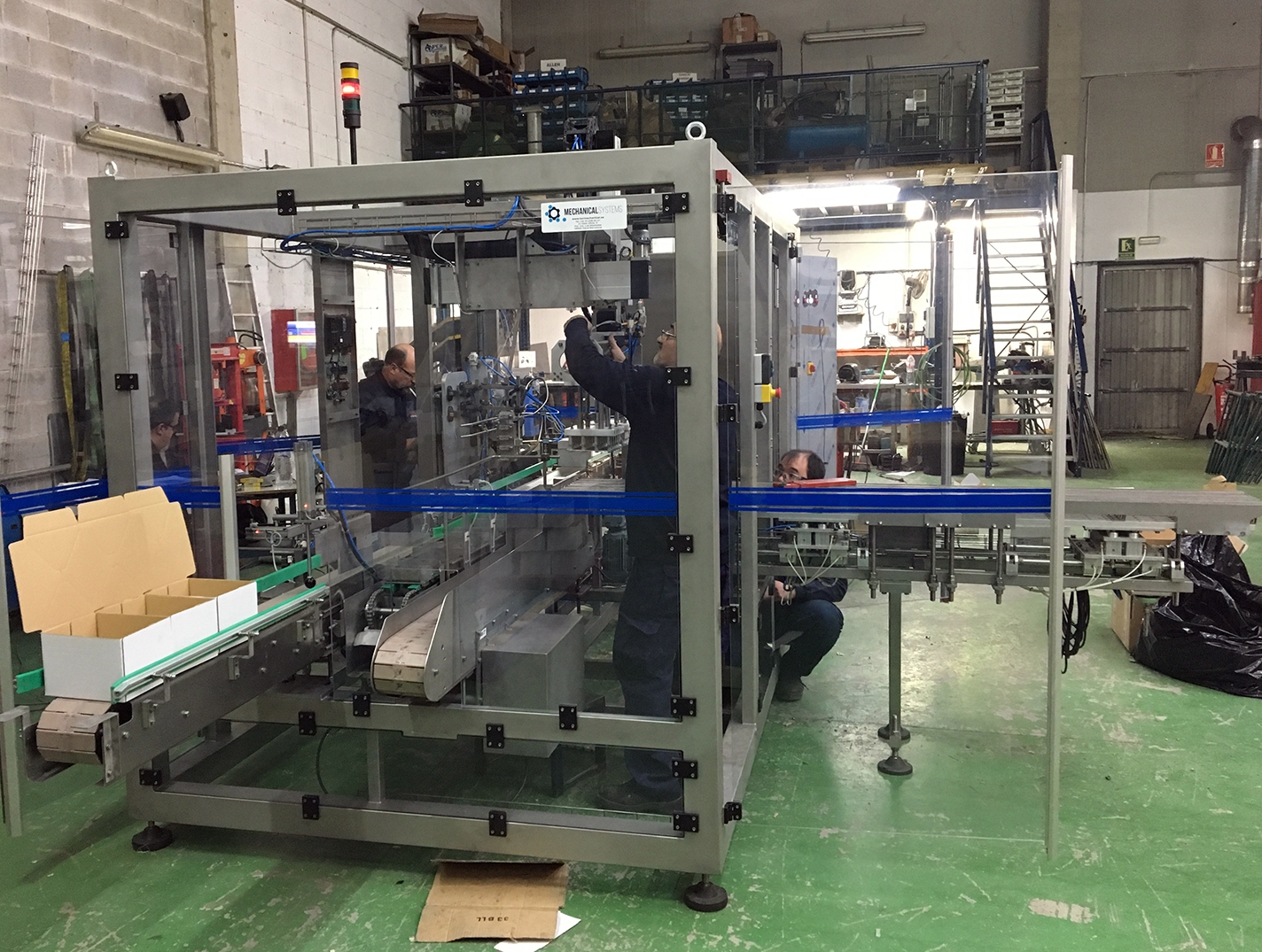Quan tot passa en un espai reduït: Formadora de caixes, carregadora de producte i zona encolat en continu. Cal disposar de bons equips de control i moviment. En aquest cas, integrar el sistema d’eixos “x,y” de siemens ens va aportar una gran facilitat de maniobra.